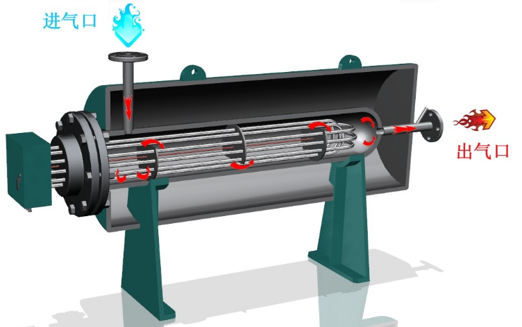 首先給大家講解一下空氣電加熱器的工作原理,加熱的氣體經(jīng)送風機或進氣閥進入到加熱艙的換熱艙,再經(jīng)過加熱管加熱并在換熱艙內(nèi)充分換熱達到所需的溫度時,從出氣口出來。出氣口上裝有溫度傳感器,專門用來采集溫度信號傳給控制系統(tǒng),再由控制系統(tǒng)控制加熱器的功率輸出,以達到自動控溫。在換熱艙內(nèi)亦裝有溫度傳感器,主要用于監(jiān)測加熱管的溫度,當加熱管超溫或超出設定溫度范圍時,自動切斷電源,停止加熱。